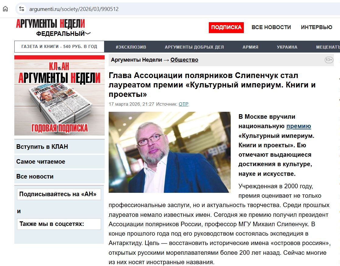 Учрежденная в 2000 году, премия оценивает не только профессиональные заслуги, но и актуальность творчества. Среди прошлых лауреатов немало известных имен. Сегодня же премию получил президент Ассоциации полярников России, профессор МГУ Михаил Слипенчук. В конце прошлого года под его руководством состоялась экспедиция в Антарктиду. Цель — восстановить исторические имена «островов россиян», открытых русскими мореплавателями более 200 лет назад. Сейчас многие из них носят иностранные названия.